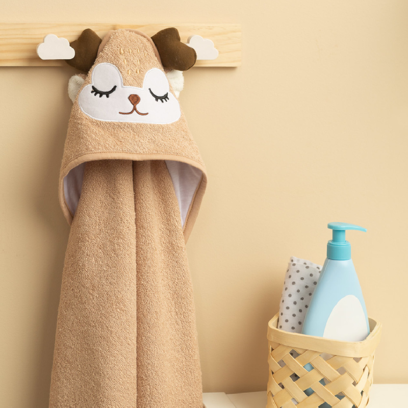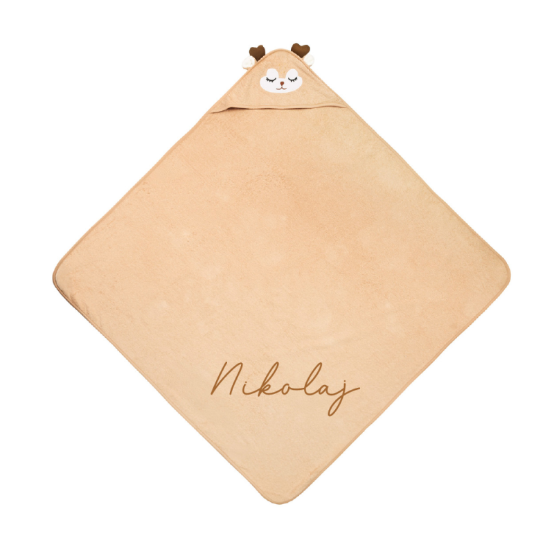 Brisača je izdelana iz frotirja. Je mehka, prijetna na dotik in enostavna za likanje. Brisača za dojenčka ima je velika 100x100 cm in ima prostorno kapuco, z očarljivim vezenjem živali in ime dojenčka.