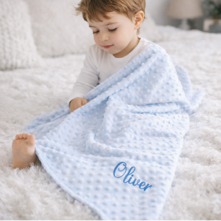 Lahka odejica, na katero izvezemo ime dojenčka, lično pakirana v darilno škatlo z imenom.
