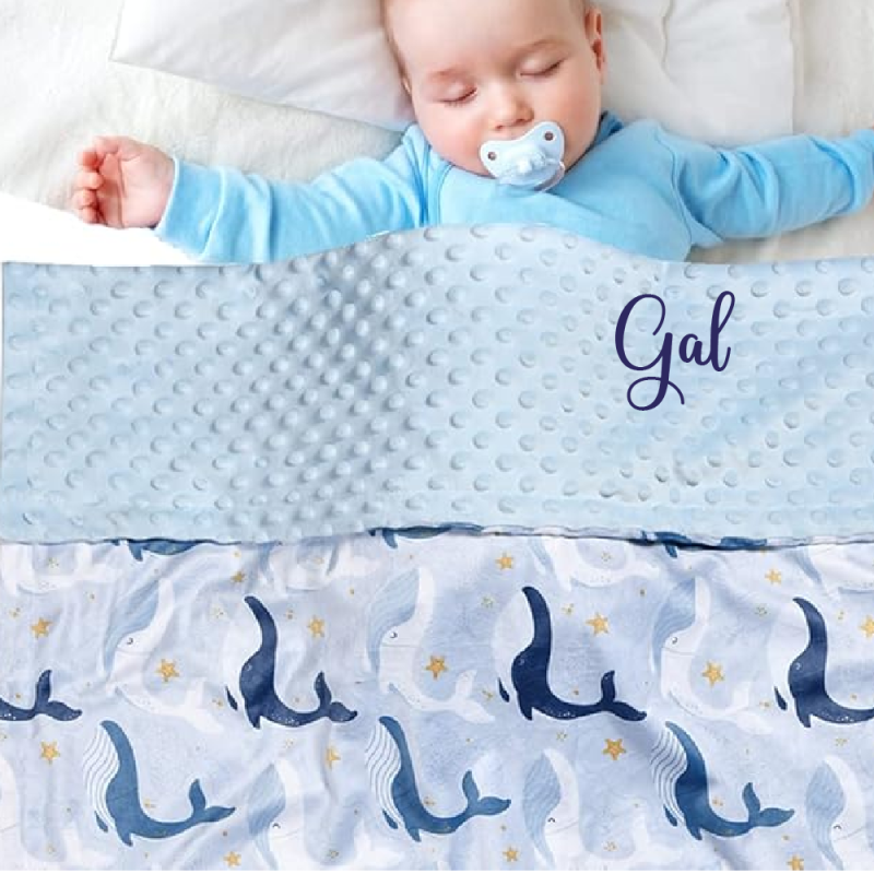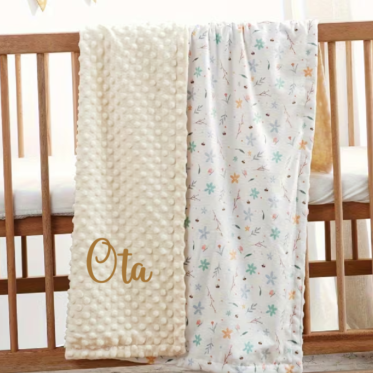 Mehka odejica, na katero izvezemo ime dojenčka, lično pakirana v darilno škatlo z imenom.