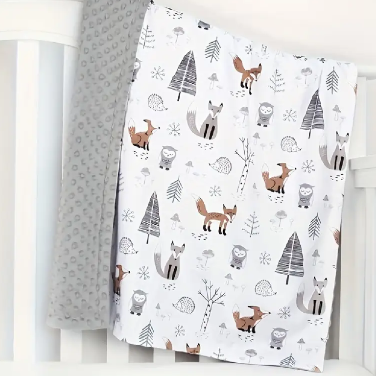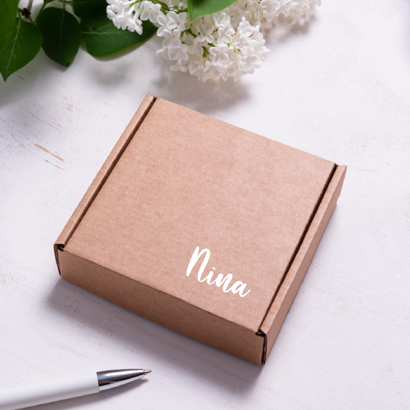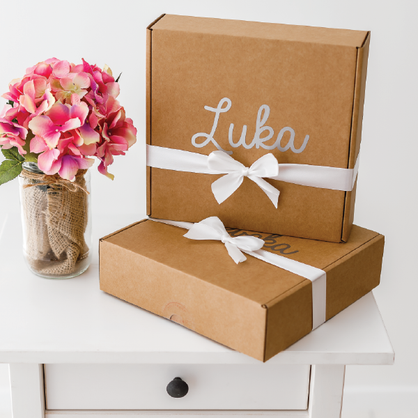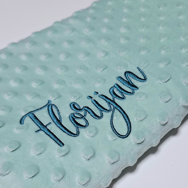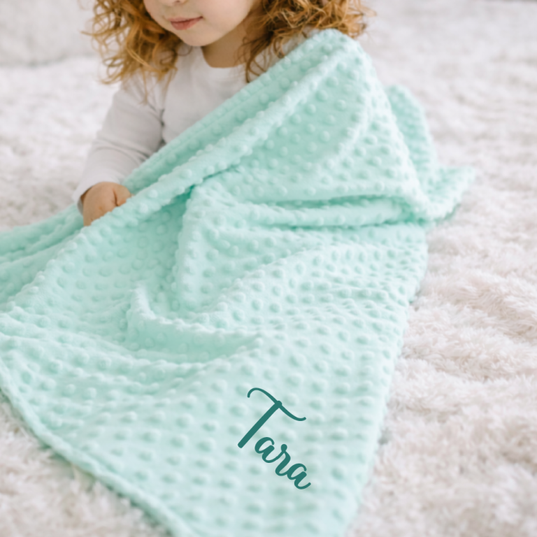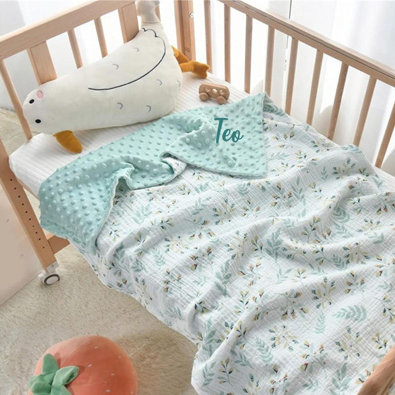 Lahka odejica, na katero izvezemo ime dojenčka, lično pakirana v darilno škatlo z imenom.