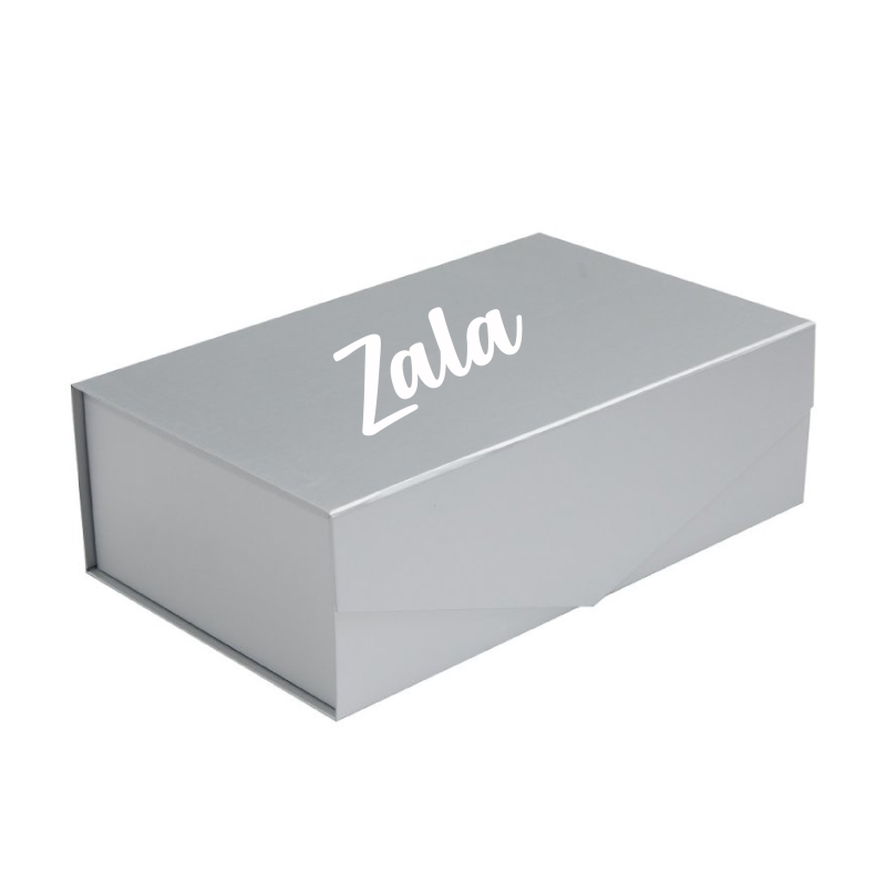 Škatla je sive barve in ima na vrhu napisano ime dojenčka, s čimer bomo darilo naredili še bolj osebno.