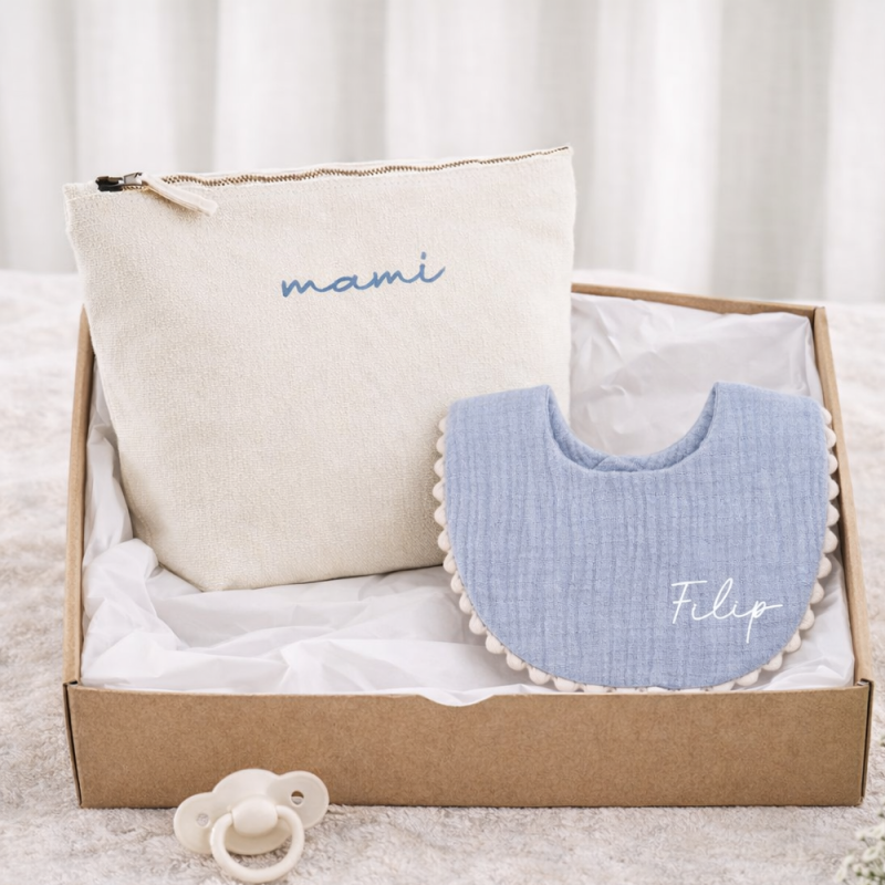Elegantna darilna škatla z dojenčkovim imenom – celoten paket je skrbno zapakiran v elegantno darilno škatlo, ki z napisanim imenom dojenčka doda pridih edinstvenosti.