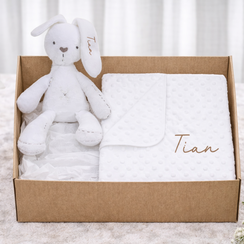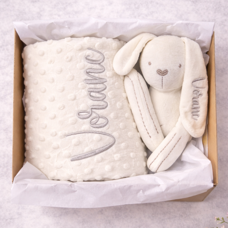 Podarite popolno prvo darilo novorojenčku in mamici, z našim skrbno izbranim darilnim paketom! V tem čudovitem kompletu boste našli mehko odejico in prikupnega belega zajčka – oba personalizirana z izvezenim imenom dojenčka, kar bo paket naredilo resnično edinstveno darilo.
