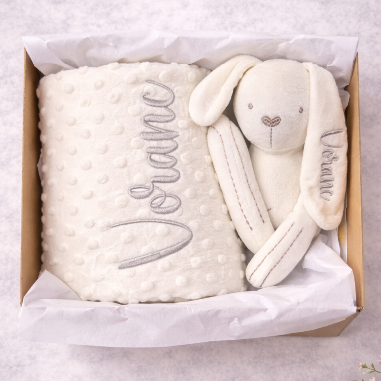 Celoten paket je skrbno aranžiran v elegantni darilni škatli, ki je prav tako označena z dojenčkovim imenom, kar ji daje dodaten oseben pridih. Ta komplet je popolno darilo za novorojenčke, krst ali posebne priložnosti, ki ga bodo starši in malčki cenili še vrsto let. Razveselite svoje najdražje z darilom, ki prinaša toplino, udobje in ljubezen!