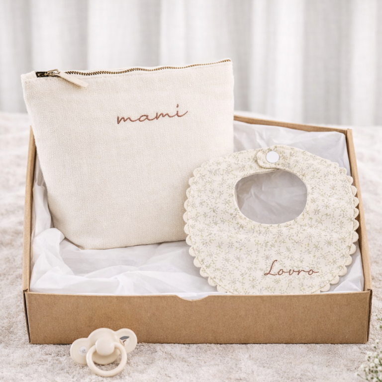 Lahka odejica, na katero izvezemo ime dojenčka, lično pakirana v darilno škatlo z imenom.