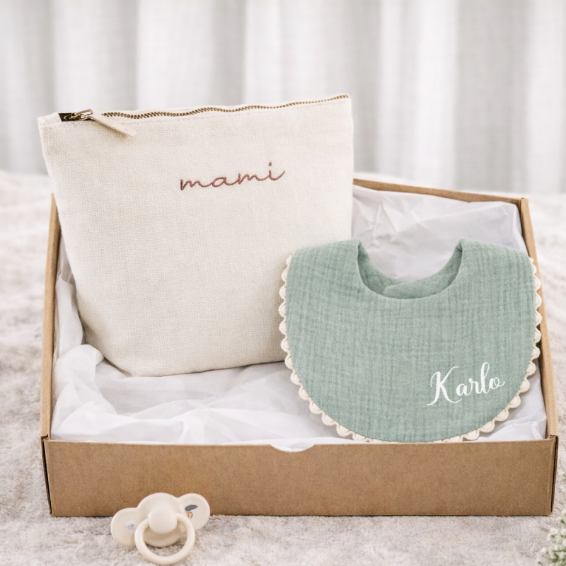 Elegantna darilna škatla z dojenčkovim imenom – celoten paket je skrbno zapakiran v elegantno darilno škatlo, ki z napisanim imenom dojenčka doda pridih edinstvenosti.