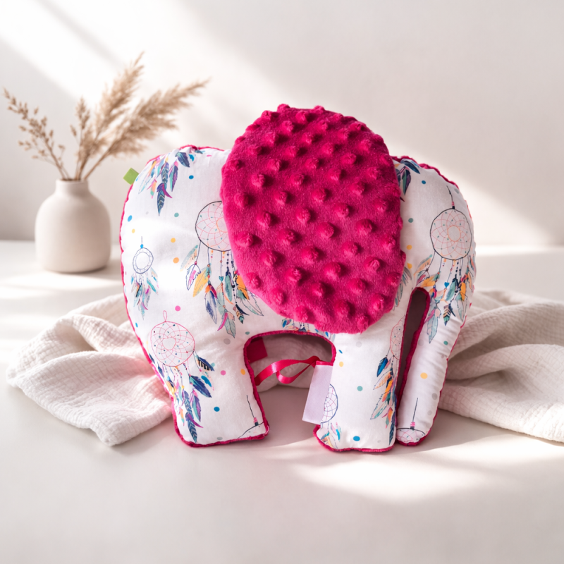 Nežen slonček za crkljanje. Čudovit ročno izdelan slonček, je popoln spremljevalec za najmlajše. Izdelan je iz izjemno mehke minky tkanine in nežnega bombaža z igrivim vzorcem lovilcev sanj. Zaradi svoje oblike je idealen za crkljanje, igro ali kot prikupna dekoracija otroške sobe.